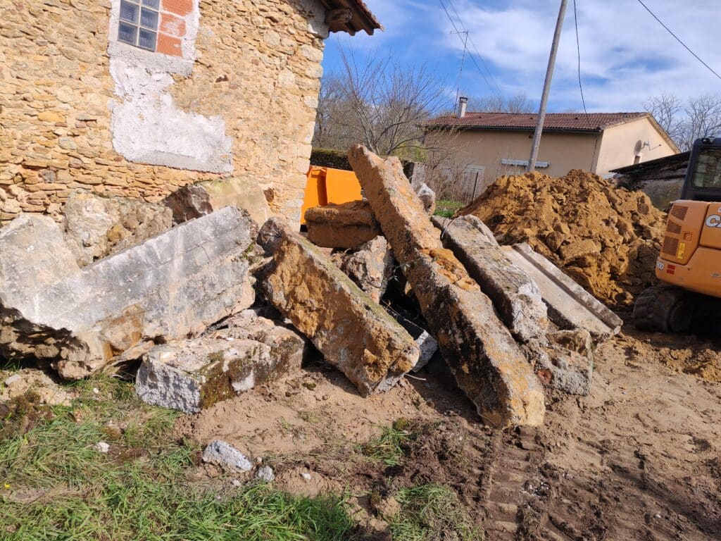 Le volume de gravats généré par ce type de chantier peut être conséquent. Nous avons donc mis en place un tri sélectif dès la phase de démolition : les inertes (pierres, terres, tuiles) ont été orientés vers les plateformes de traitement agréées, et les éléments valorisables séparés pour recyclage. Ce n’est pas anecdotique — sur une maison ancienne en pierre, une part non négligeable des matériaux peut trouver une seconde vie, ce qui allège d’autant l’empreinte environnementale du chantier.