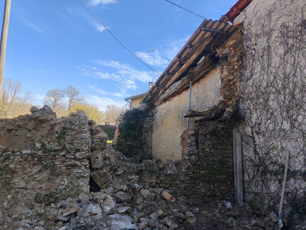 La maison concernée relevait d’une maçonnerie traditionnelle en moellons, montée au mortier de terre ou de chaux — un type de construction qui se comporte très différemment d’un bâti récent en parpaings. Ce genre de structure, en vieillissant, peut présenter des zones de faiblesse difficiles à repérer à l’œil nu, surtout lorsque le lierre a colonisé les murs sur plusieurs années. La végétation masque les fissures, les effondrements partiels, les désolidarisations de pierres… autant de points qu’il faut anticiper avant même de lancer les travaux.
